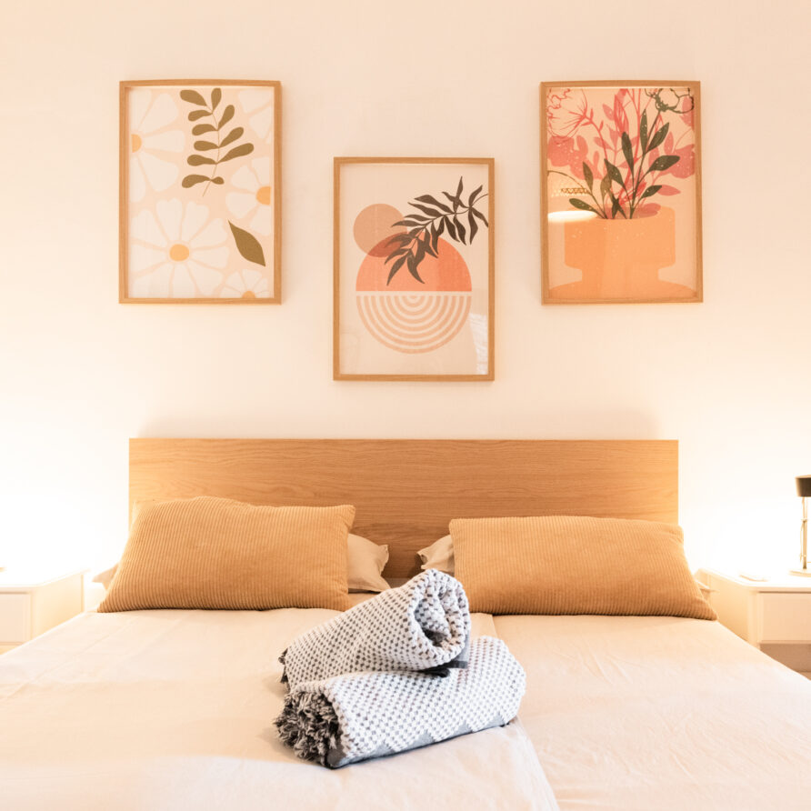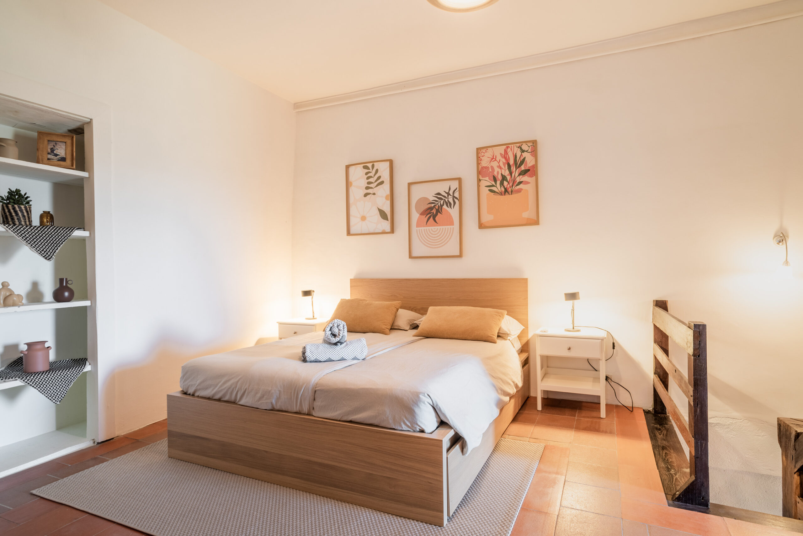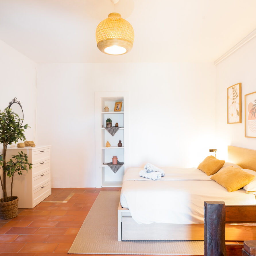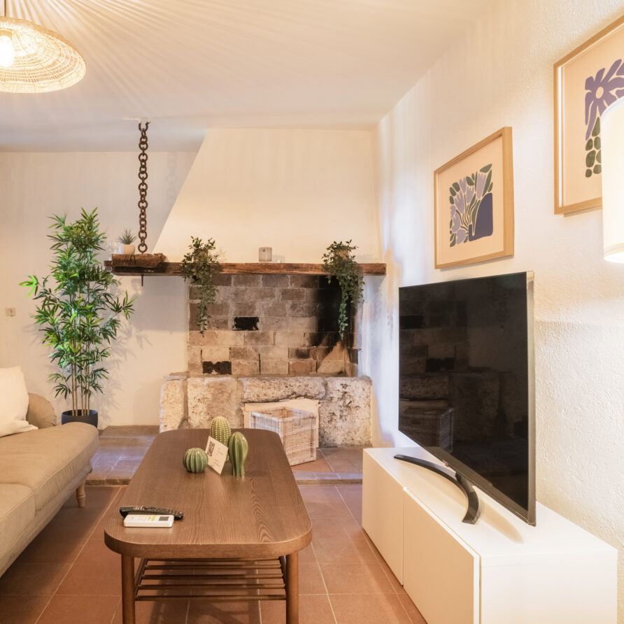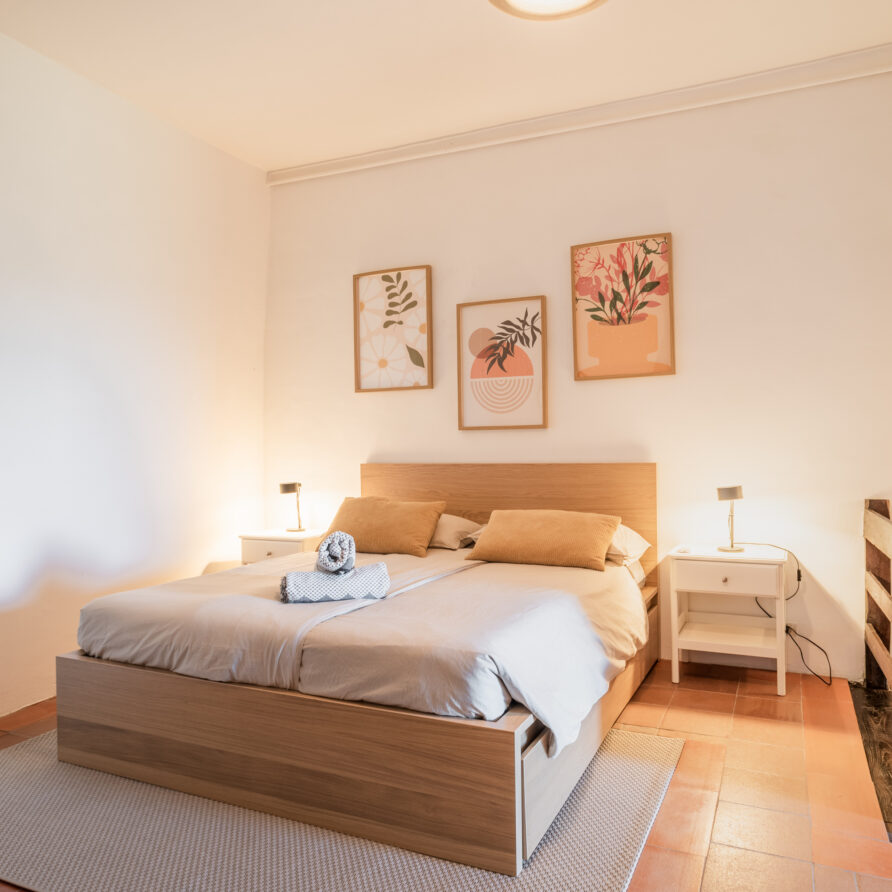 Lejligheden er velegnet til en familie med to børn, da man skal igennem det ene værelse for at komme til det andet. Indretningen består af et stort køkken-alrum, tilhørende stue med adgang til badeværelse med badekar samt en overdækket terrasse. På første sal finder du et soveværelse med dobbeltseng og adgang til et mindre værelse med sovesofa. Begge etager har aircondition.