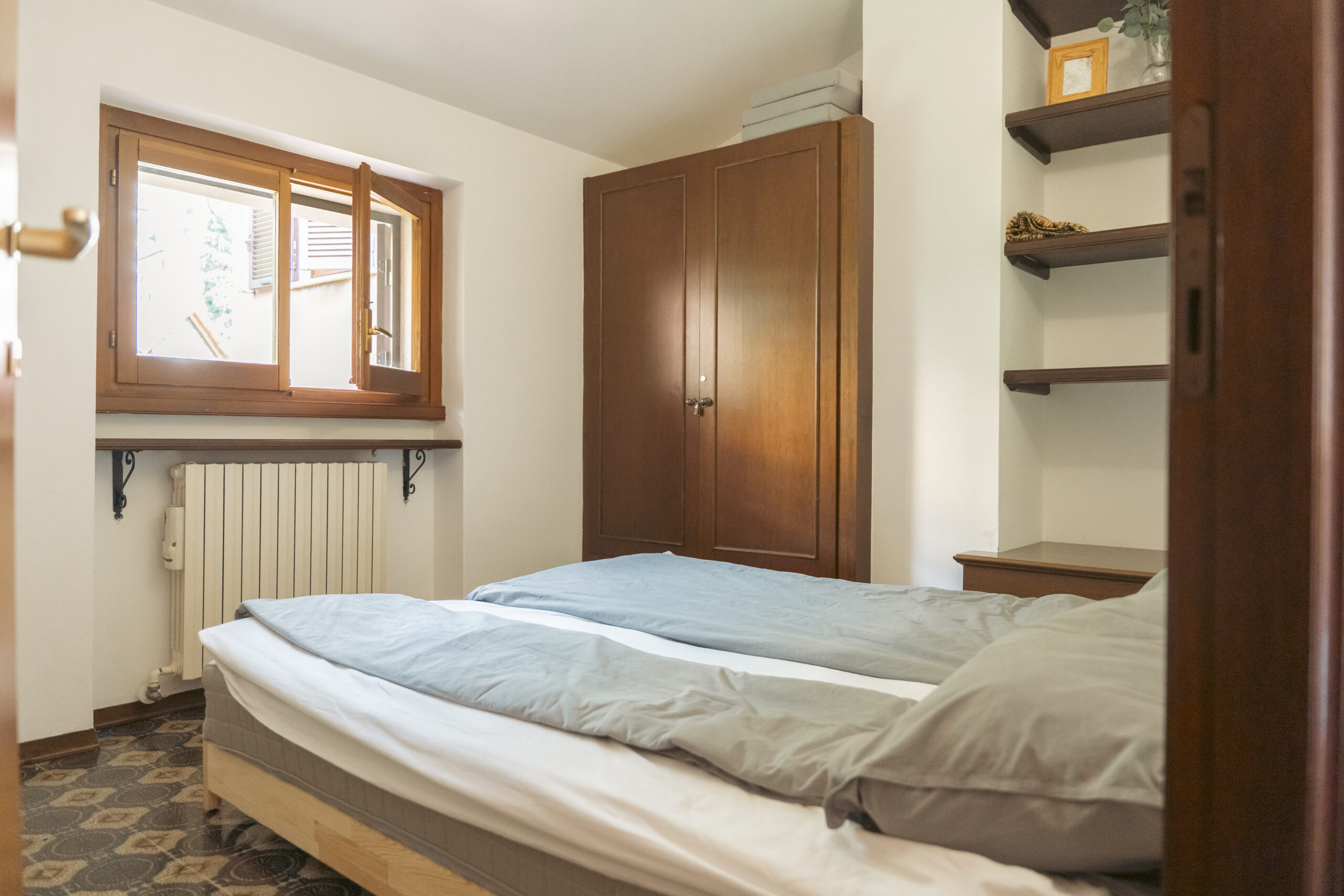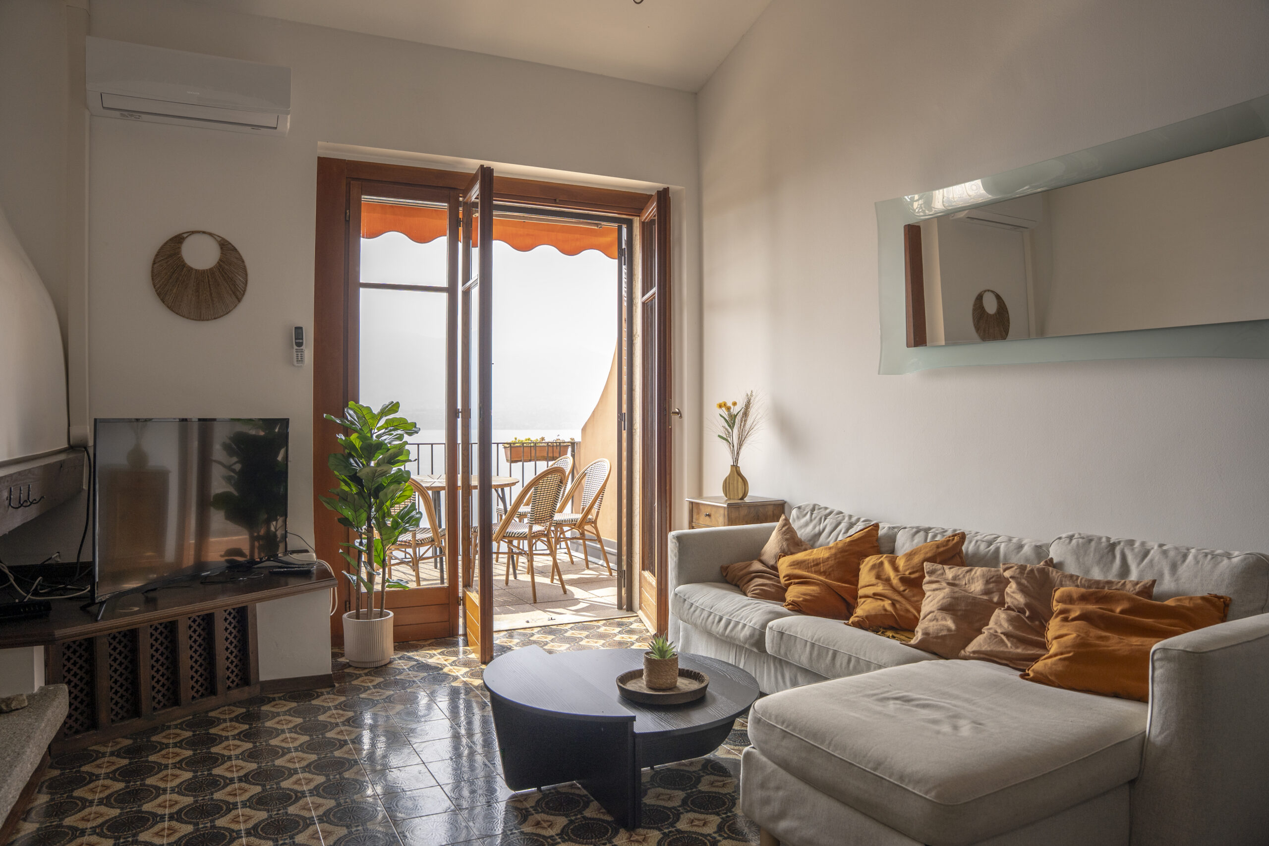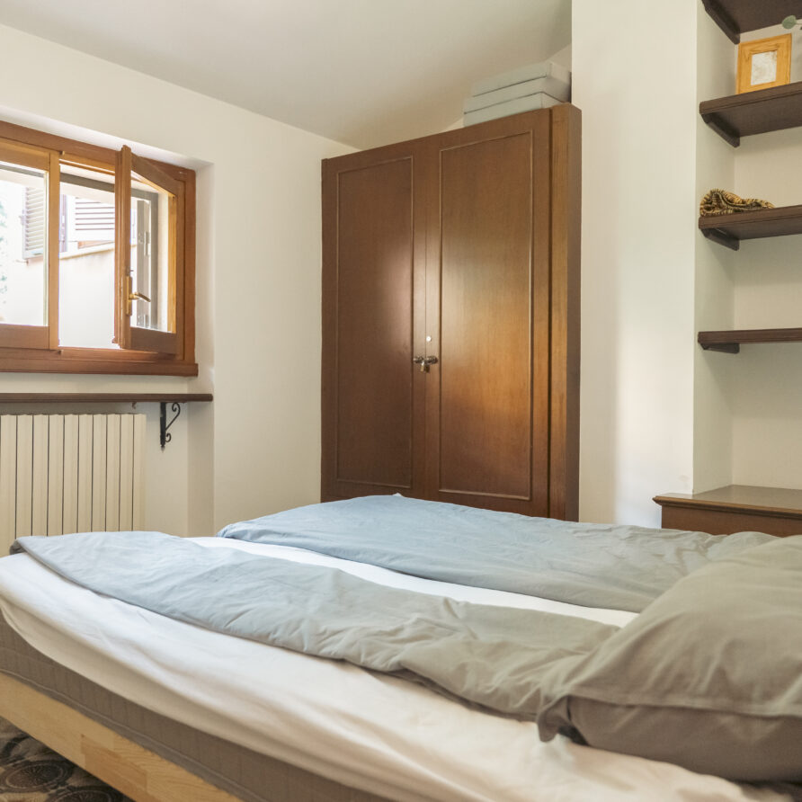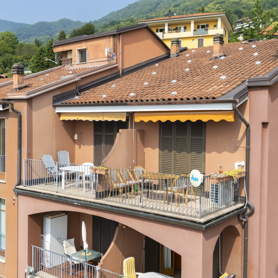 Lejligheden ligger på sjette sal i et feriekompleks og er fordelt på to etager. Her er tre soveværelser, to badeværelser og en stue. Det mindste værelse på første sal har to enkeltsenge, der lige nu står samlet som en dobbeltseng. Fra stuen er der adgang til en balkon med en fantastisk udsigt over Lago Maggiore.