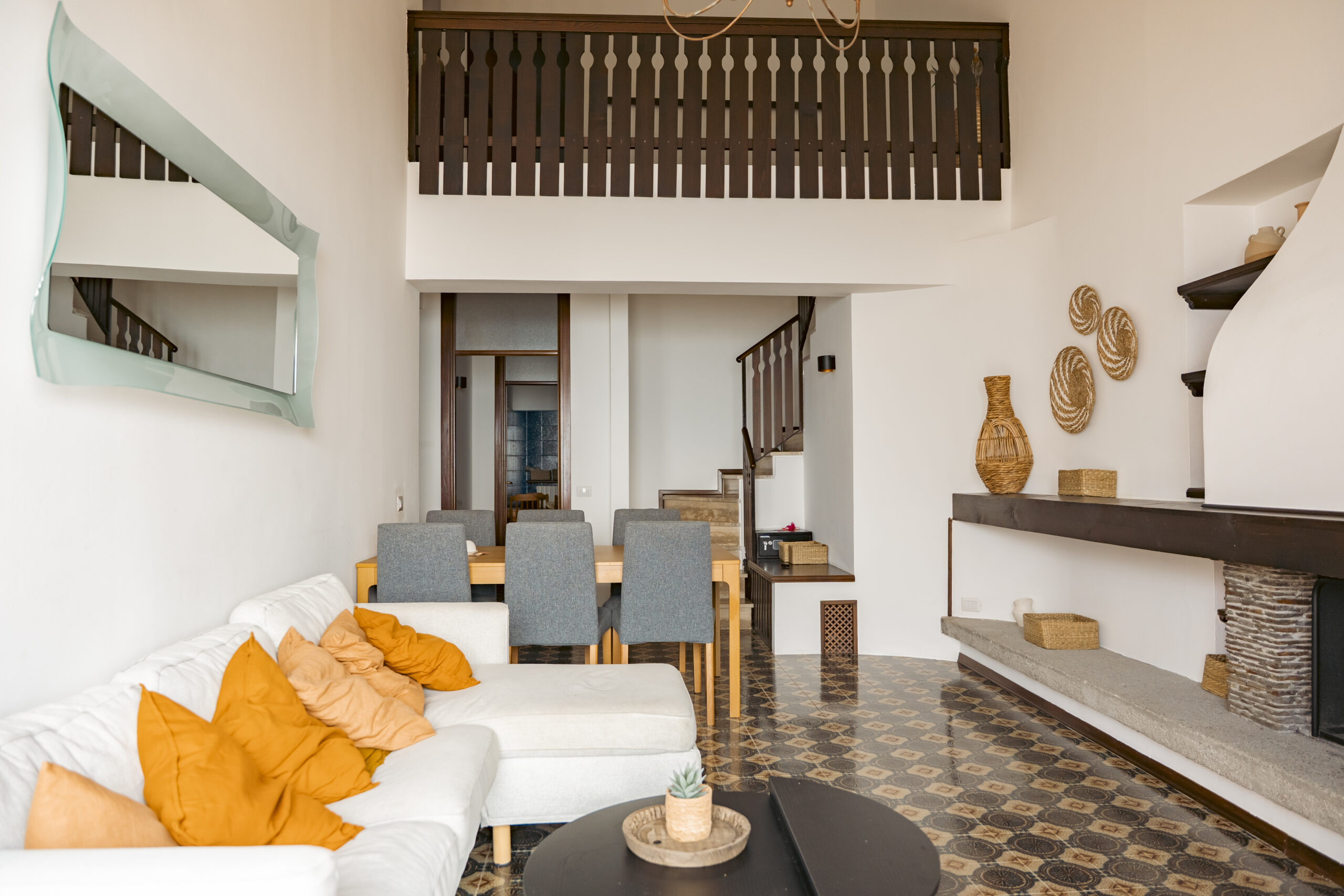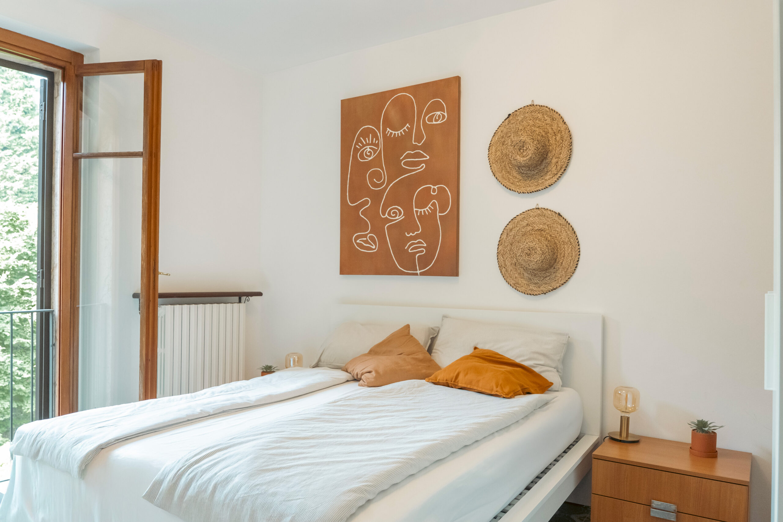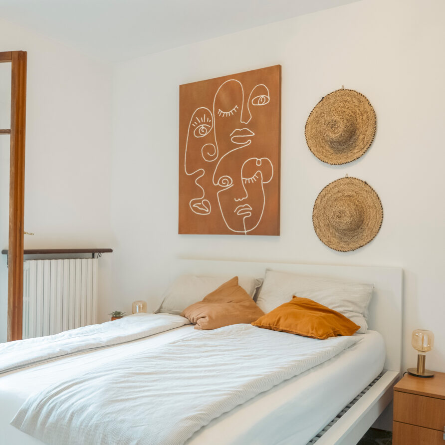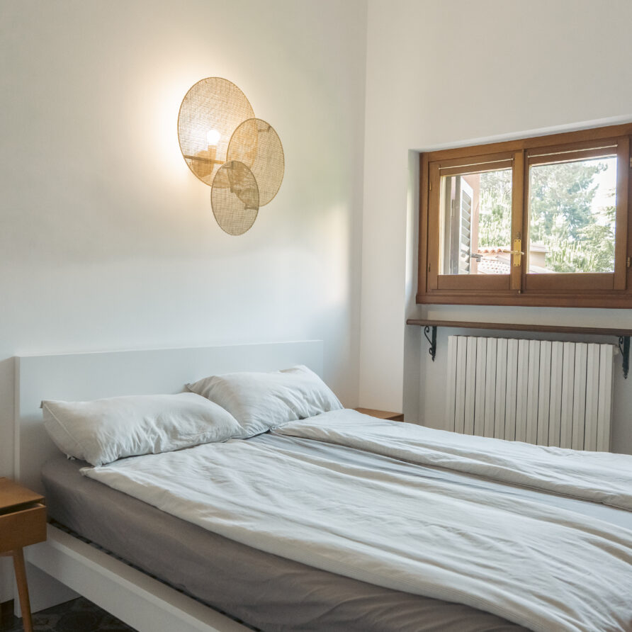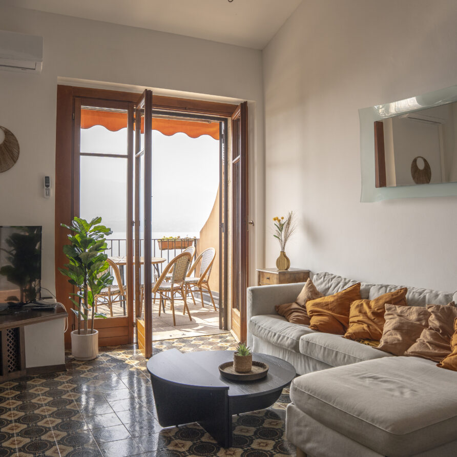 Lejligheden ligger på sjette sal i et feriekompleks og er fordelt på to etager. Her er tre soveværelser, to badeværelser og en stue. Det mindste værelse på første sal har to enkeltsenge, der lige nu står samlet som en dobbeltseng. Fra stuen er der adgang til en balkon med en fantastisk udsigt over Lago Maggiore.