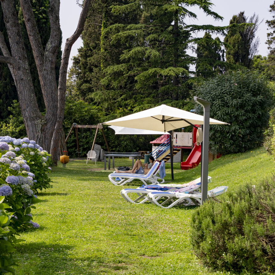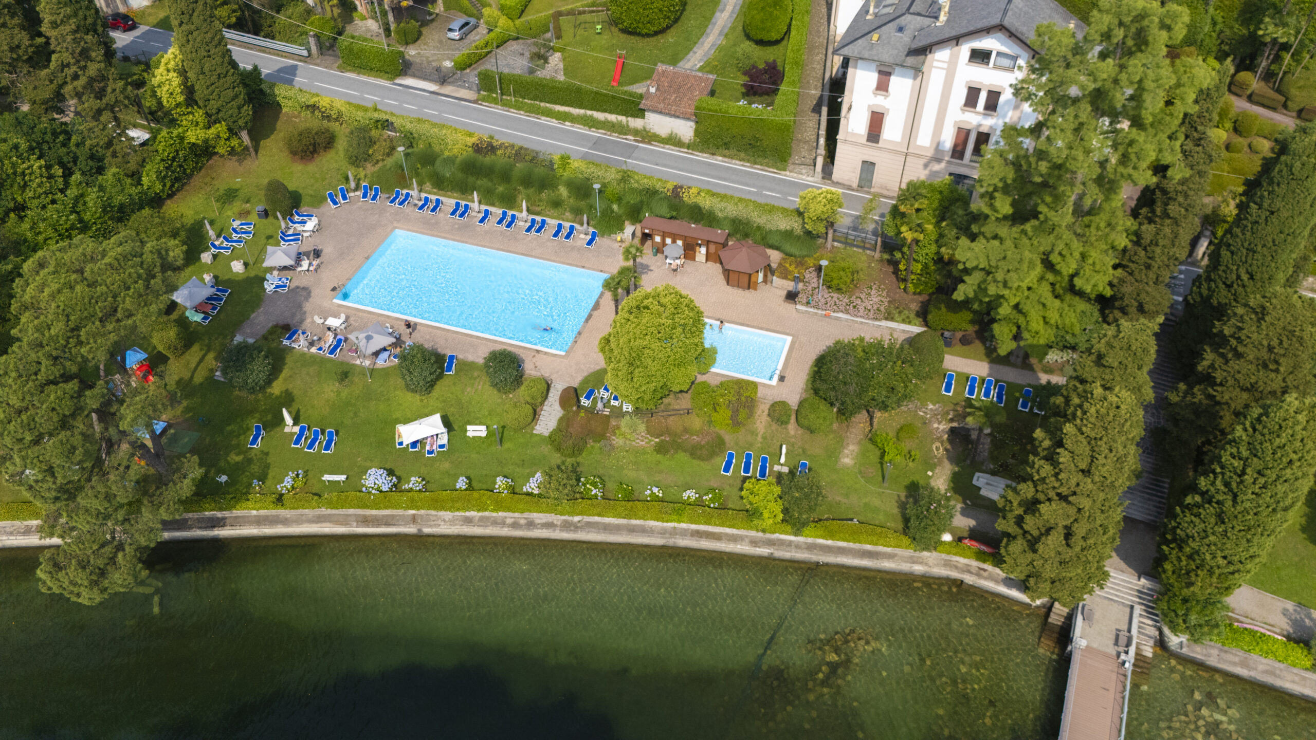 Når man har passeret den befærdet hovedvej, kommer man til det skønneste pool og sø område med mange smukke Hortensiaer, som høre til lejligheden. Her er lille legeplads, bordtennisbord, automat med kolde og varme drikke, omklædningsrum med bruser og dejlige liggestole.