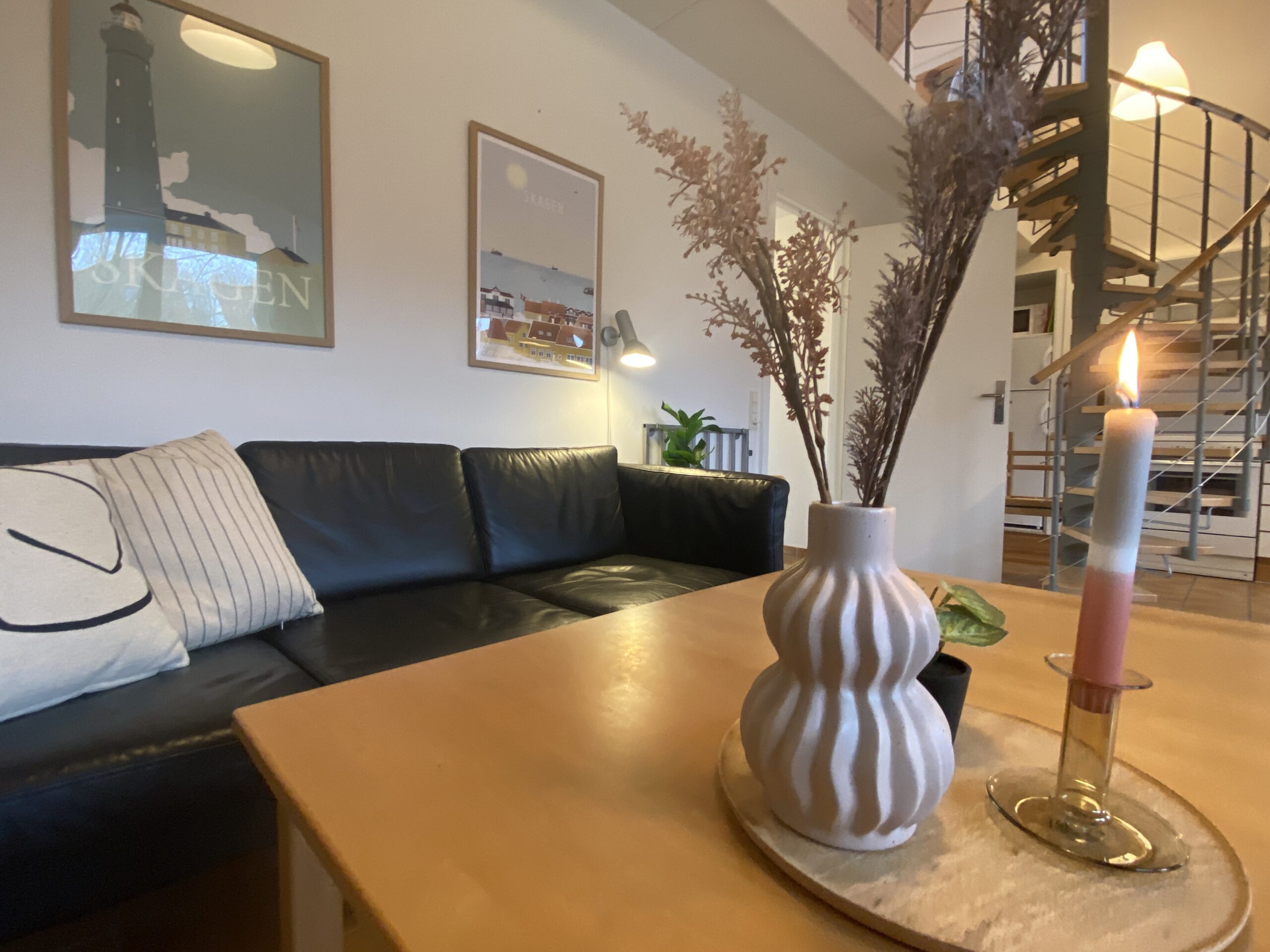 Lejligheden, hvor der er hvad der skal være og det hele er fint vedligeholdt. Det tager cirka 10 minutter, så er man i Skagen Centrum.